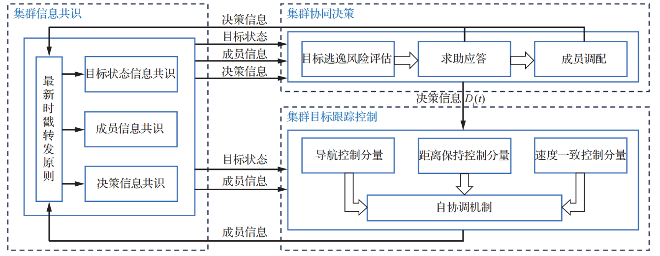 针对现有集群无人机目标分配方法在实时协同决策与调配方面的不足,本文提出了一种面向多目标跟踪的集群无人机自组织共识决策方法。该方法基于分布式架构,通过集群内部的信息动态共享,实现无人机个体间的信息共识和基于信息共识的自主协同决策。整体架构包括3大关键模块:集群信息共识、集群协同决策与集群目标跟踪控制。