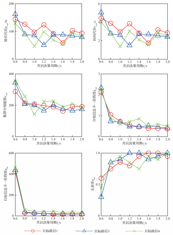 研究结果表明,所提出的共识决策方法可在多目标分离运动的场景下实现集群的自组织分组,适用于集群无人机跟踪多个分散运动目标的场景。算法对目标的机动以及条件参数的变化具有适应性,共识决策机制在其能力边界内可保持无差率在0.9左右。