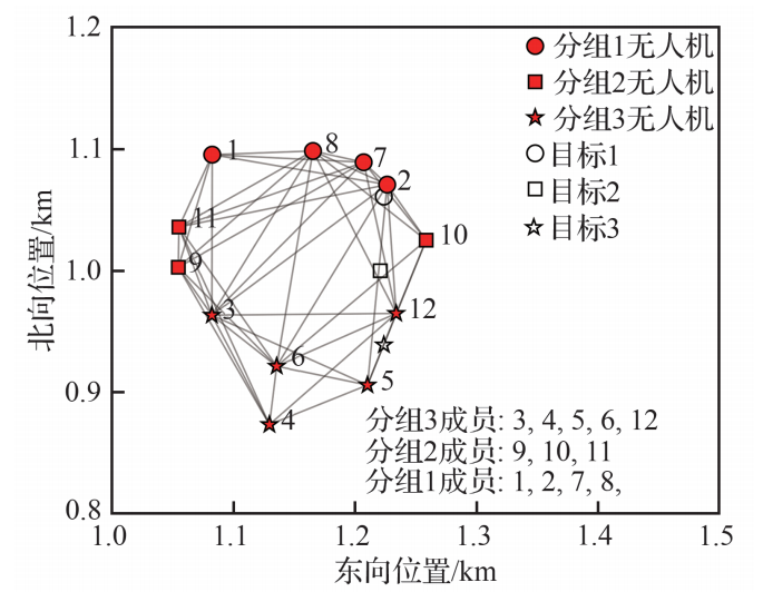 本文提出的方法可在目标跟踪过程中实现动态目标分配决策,可根据各目标的逃逸风险大小确定为各目标分配的无人机数目。在MATLAB仿真环境中,模拟由12架无人机组成的集群对3个地面移动目标进行跟踪。